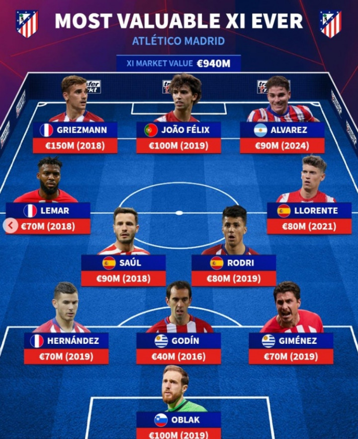 先锋:格列兹曼(2018,1.5亿)、菲利克斯(2019,1亿)、阿尔瓦雷斯(2024,9000万)